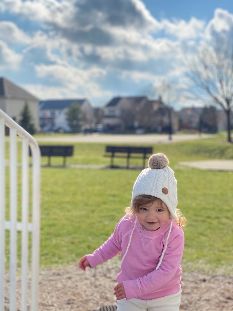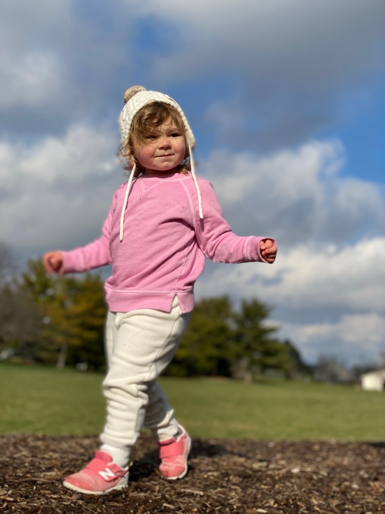My little daredevil lives for these moments at the park (imagine her hollering that word, a barely audible “puh”, drawing out the long arrrr, and ending with a cutting “k” at the end), the times she can push her boundaries and try new things. I’m seeing the natural explorer break through in her personality as she tries to keep up with the physical abilities of some other children more than twice her age.